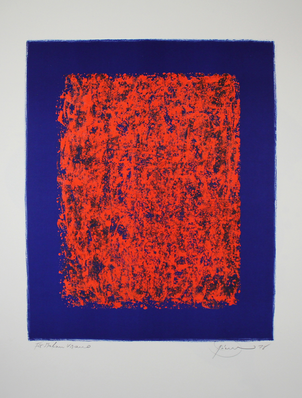 Cerbera Gallery is also pleased to showcase one of Piene’s most noticeable works, “Sponge”. Over a rectangular color area in bright ultramarine blue, the artist has placed a smaller rectangular form of loosely structured color splashes and streaks in fiery vermilion. Thus, the cold-warm contrast between the two colors and the contrast between the unstructured, quiet flatness of the blue, and flickering-lively structure of the red cause an exciting composition.