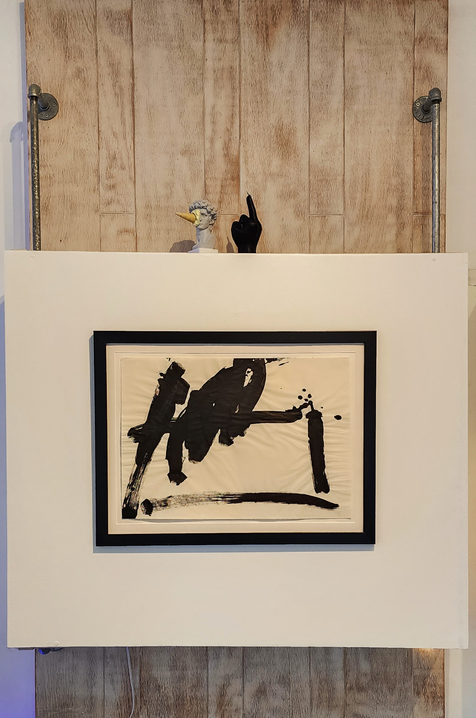 Plate by Ilona Romule, Photographs in the background by Michael Mardikes (depicting Thomas Hart Benton), “Monroe” by Andy Warhol (Multiple authorized by the Warhol Foundation), Blue Abstract by David Morris