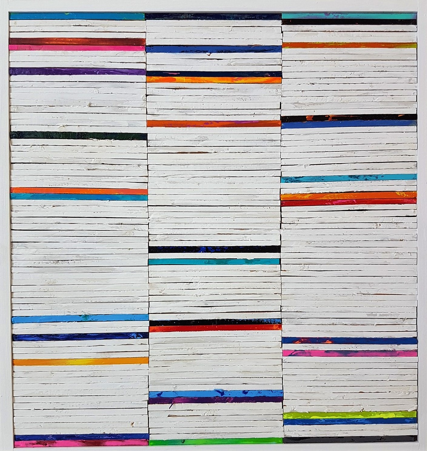 Tim Hahn In this time where you can’t tell the difference between much of the art produced and media advertising, or comic book illustrations or work that is computer generated, Tim Hahn is trying to produce work that is successful on a basic level. He is trying to make pieces function as more than a painting but as an “object” through the use of the chosen materials and processes. The work is about the physicality of the object and the relationships of colors, forms, and materials.